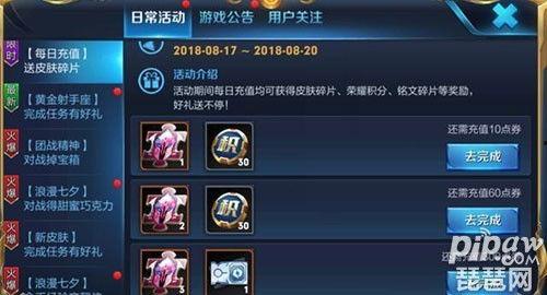 听说这次《王者荣耀》的充值活动可是相当给力哦!只要你充值,就能享受到超多福利,让你在游戏中畅游无阻!